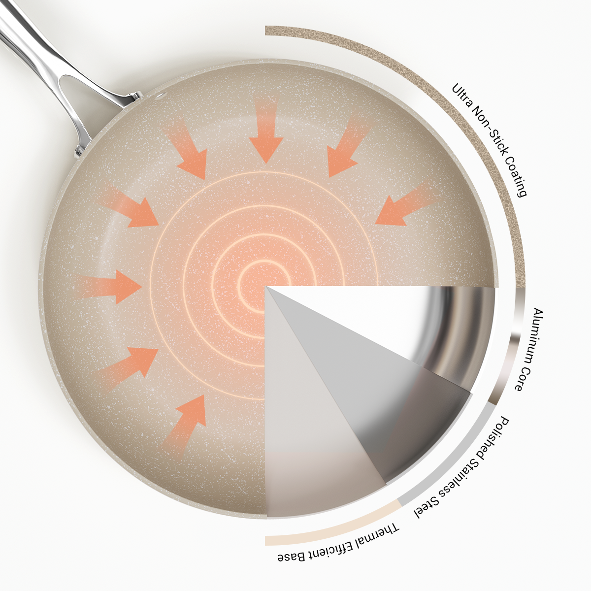 Our cookware features 3.0 milimetethick,4-ply for better heat distribution and retention.